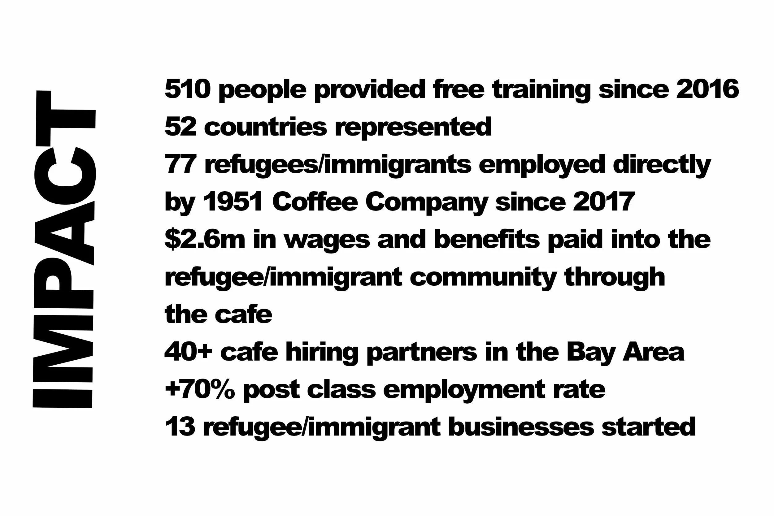 1951 Coffee Company is a nonprofit café and roastery in Berkeley dedicated to helping immigrants and refugees get started in the coffee industry. Through free barista training, paid apprenticeships, and job placement, the organization creates a direct pathway to stable work and long-term careers in specialty coffee.